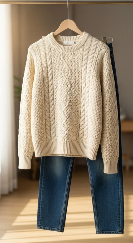 A cream sweater instantly gives a clean look without much effort. Straight-leg jeans keep the outfit balanced and comfortable. Choose mid-wash denim for a soft contrast. Add simple earrings and a structured tote. If you want a budget trick, buy a neutral thrifted sweater and lightly shave off pilling to refresh the texture. You can also tuck the front hem slightly to shape your waist. Finish with white sneakers or loafers. Add a light scarf if it’s chilly. This combo works for brunch, errands, or casual meetups.