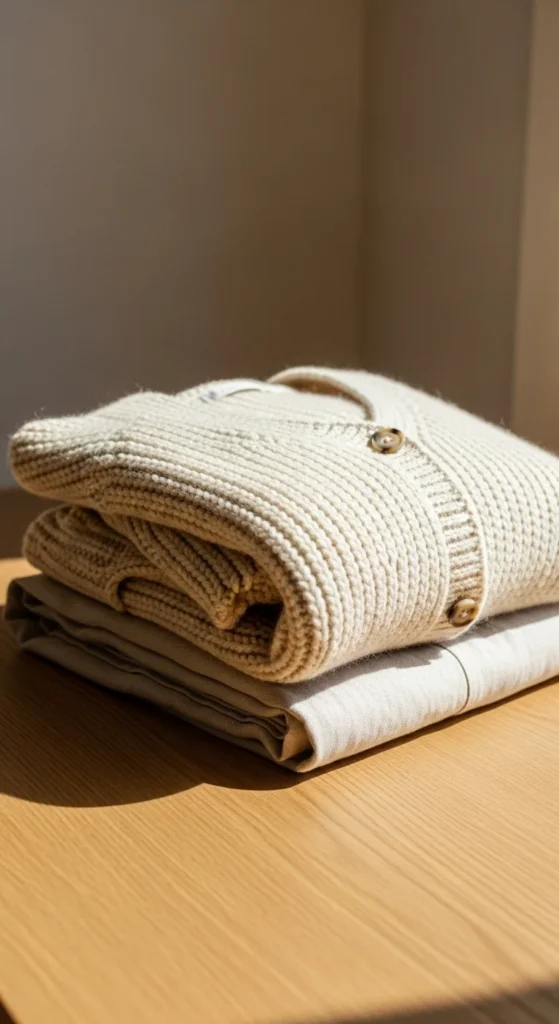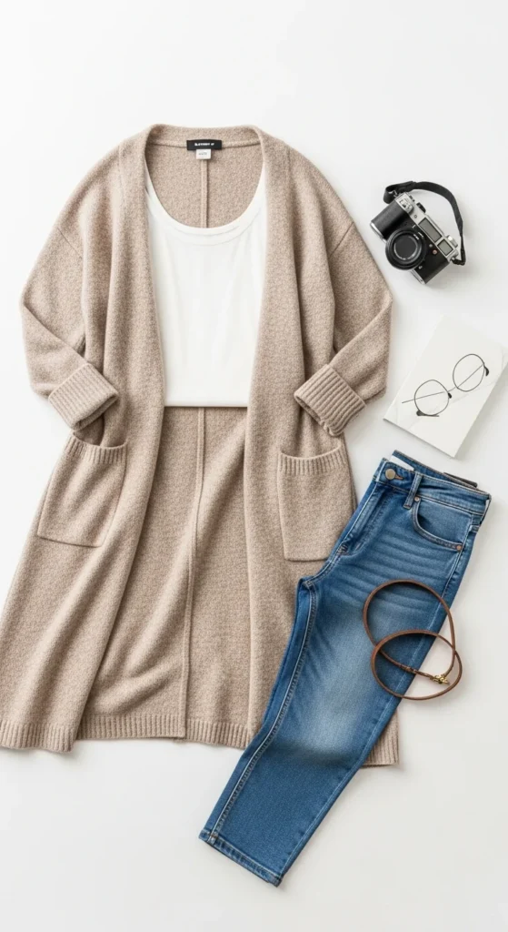 A cozy cardigan paired with linen pants creates an airy, effortless style that still looks intentional. Choose neutral tones like beige or soft greys for a calmer palette. Add a fitted tank or tee underneath. If you want a cost-friendly idea, buy linen-blend pants instead of full linen—they look similar but cost less. Finish with sandals or simple sneakers. Add a light necklace to keep the look refined. This outfit works for relaxed meetups or casual home gatherings.