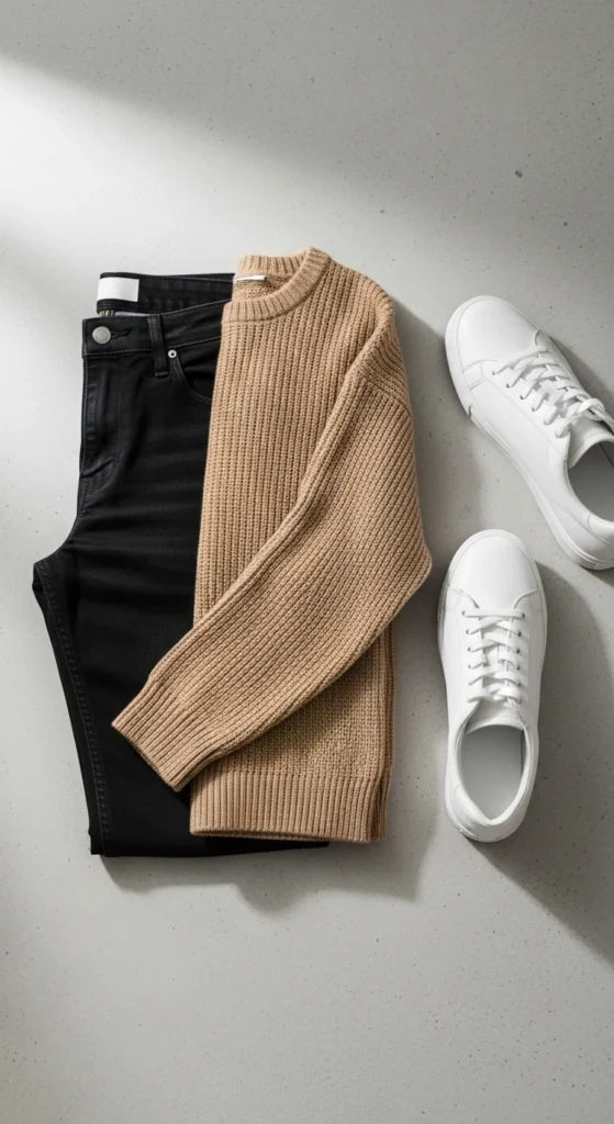 Black jeans always look sharp, and a beige sweater softens the outfit. White sneakers make the look clean and modern. If you want an affordable upgrade, use a fabric comb to tidy older sweaters. Add small accessories like a thin bracelet or a subtle pendant. Choose a compact bag. This combo works for any daytime gathering.