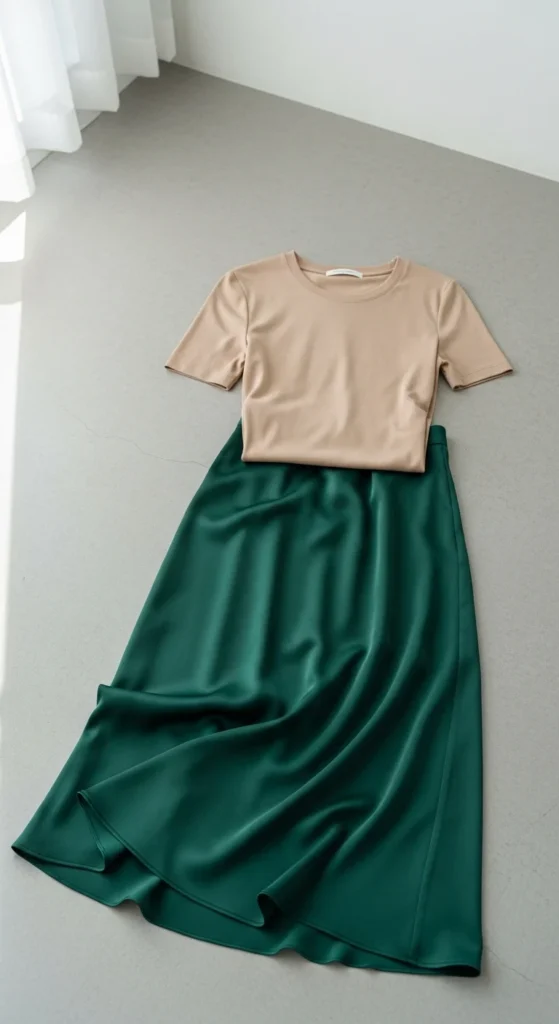 A midi skirt brings gentle movement, while a fitted tee balances the silhouette. Choose satin, cotton, or soft pleated textures. Add sandals or simple heels. If you want a cost-saving approach, pair older tees with new skirts to refresh your wardrobe. Light jewelry keeps the look calm. Bring a small bag for a tidy finish.