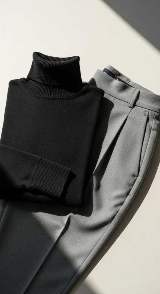 2. Black Turtleneck + High-Waist Trousers