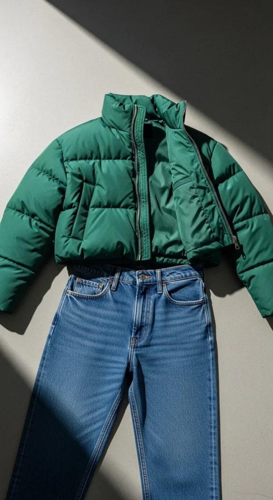 A cropped puffer creates a cozy winter silhouette. Straight jeans keep the look balanced. Choose neutral puffers like cream, taupe, or black. If you want to save money, refresh an old puffer by washing it with tennis balls to fluff it up. Add sneakers or boots depending on your outing. A small crossbody bag works well.