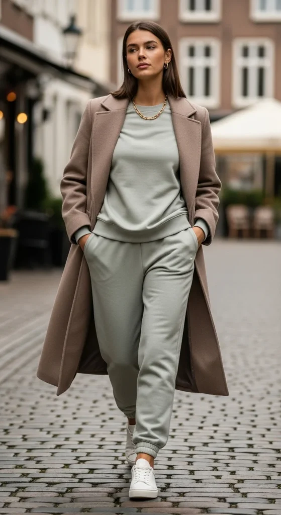 A lounge set feels comfortable while a long coat adds an instant polished layer. Choose muted tones like grey or oatmeal. Add white sneakers or slip-on shoes. If you’re managing your budget, repurpose older lounge pieces and pair them with a newer coat. Keep accessories minimal, maybe tiny hoops or a slim bracelet. Carry a simple bag.