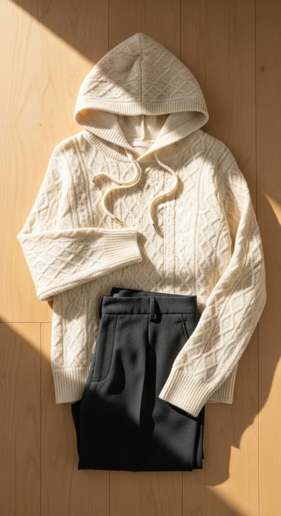A knit hoodie offers comfort, while tailored trousers bring structure. This pairing works surprisingly well for casual New Year plans. Choose neutral colors for both pieces. Add loafers or sneakers. If you want a budget-friendly option, buy a knit hoodie without heavy branding for a cleaner look. Keep accessories soft and minimal. A small shoulder bag completes the outfit.