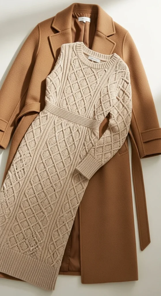A neutral knit dress creates a soft, relaxed base. Adding a long coat makes the outfit feel organized and warm. Pick beige, cream, or light brown for a calm palette. To stay budget-friendly, buy a simple knit dress and add a belt to shape your waist. Wear ankle boots or low heels depending on the occasion. Keep jewelry minimal. A small shoulder bag adds a finishing touch. This look works for both coffee dates and small New Year gatherings.