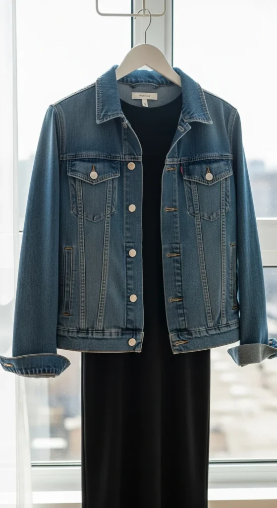 A denim jacket keeps your outfit comfortable while the black dress adds a clean base. This pairing suits both day and night outings. Choose a straight or slightly fitted black dress. If you’re on a budget, refresh an older denim jacket by replacing buttons or lightly sanding edges. Add white sneakers for a daytime feel or ankle boots for evening plans. Keep jewelry light. A small crossbody bag adds the right finishing touch.