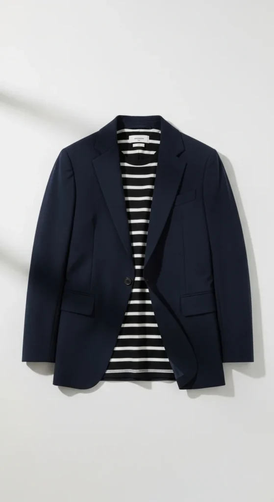 A striped tee adds character while a tailored blazer brings structure. This pairing works well for New Year plans that call for a polished yet low-effort look. Choose neutral stripes like black or navy for versatility. If you want to save money, find a thrifted blazer and get the sleeves hemmed for a better fit. Pair with jeans or slim trousers. Add loafers or ankle boots. Keep accessories simple and light.