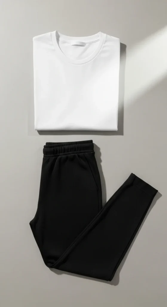 A classic white tee remains simple while polished joggers add shape. Choose joggers with tapered ankles and clean lines. Add a slim belt bag for convenience. If you want to stretch your budget, buy a multipack of tees and keep one specifically for outings so it stays crisp longer. Pair with sneakers or low-profile boots. Light accessories like a bracelet or small hoops help complete the look.