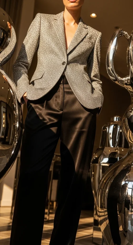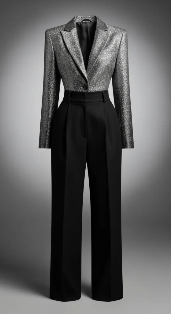 High-waist trousers create a cleaner shape that pairs well with glitter. Choose any trousers you already own—black, beige, or white. Tuck in your top to define your waist. A fitted bodysuit or tank works perfectly. For shoes, pointed-toe heels elongate the frame. If you want to keep expenses low, refresh older trousers with proper steaming. Jewelry can be minimal. This outfit suits dinners, lounges, or work celebrations. A structured mini bag complements the tailoring. You can adjust the blazer length with a hidden pin if needed. The combination feels put-together without needing a lot of layers.