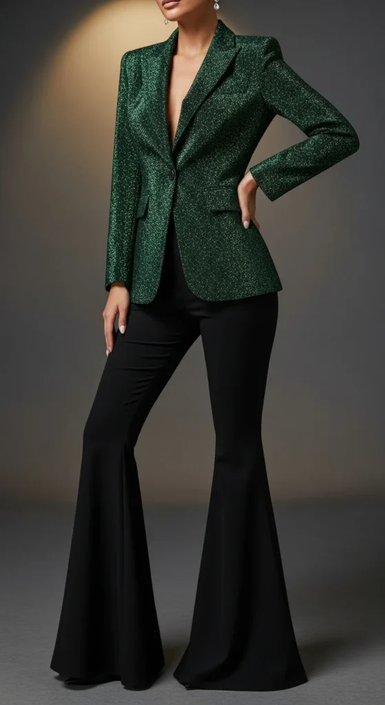 10. Deep-Green Glitter Blazer With Black Flared Pants