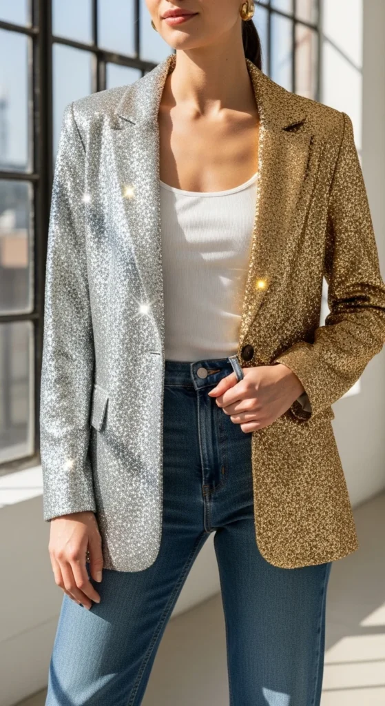 A two-tone blazer adds dimension, and pairing it with simple basics keeps the outfit balanced. Use jeans you already own and choose a tank in a neutral shade. Sneakers or boots work depending on your comfort. Add a delicate necklace or small hoops for a tiny bit of detail. This look suits laid-back gatherings or casual countdowns. For a quick DIY touch, tuck your tank slightly at the front to create shape. Carry a crossbody bag for convenience. The two-tone glitter catches light from different angles, making the outfit interesting without much effort. A soft jacket layered over the blazer can work if you need warmth, as long as it doesn’t hide too much shine. This approach is practical and easy.