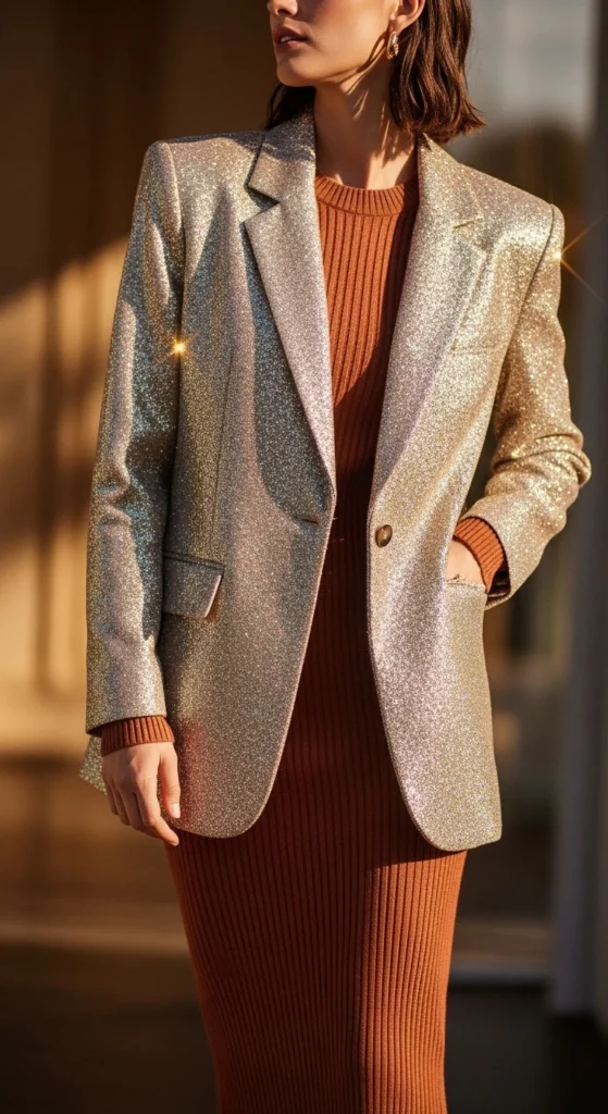 A knit dress adds comfort and shape. The glitter blazer adds sparkle without needing extra pieces. Choose a fitted or ribbed knit dress that you already own. Add ankle boots or simple heels. A crossbody or shoulder bag works depending on your style. For a budget-friendly touch, use fabric tape to smooth any loose areas on the dress. Jewelry should stay subtle. This combination works for casual gatherings or cozy indoor events. The knit texture and glitter create a nice contrast. If you need warmth, add sheer tights. You can also scrunch the blazer sleeves slightly to make the look feel relaxed. This outfit offers flexibility and doesn’t require much styling time.