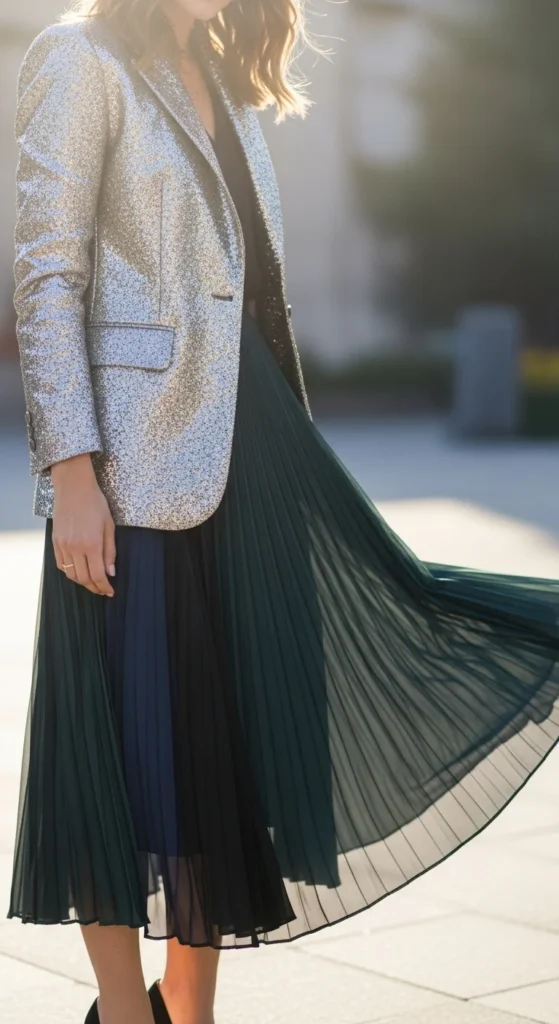 Pleated skirts add graceful movement, and pairing them with a glitter blazer feels festive without being too bold. Use any neutral pleated skirt you already own. Add a fitted top to keep the waist sharp. Heels or ballet flats both work. Jewelry can be small and refined. This look works for early evening parties or calmer gatherings. If your skirt wrinkles, steam it to revive the pleats. A clutch in a neutral or metallic shade completes the outfit. You can also add a soft shawl if it’s chilly. This setup photographs nicely because the pleats react well to movement.