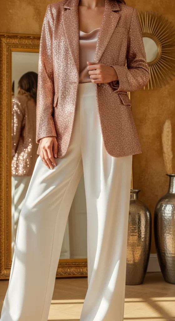 A rose-gold blazer adds warmth, and white pants help the tone shine even more. This combination feels clean and balanced. A fitted turtleneck underneath keeps the shape neat. You can wear any neutral shoe, but ankle-strap heels give a polished finish. For an affordable DIY touch, iron your wide-leg pants to create a stronger crease—it instantly sharpens the look. Jewelry doesn’t have to be heavy here; simple pearl studs or small hoops work well. If you’re worried about the blazer feeling too loud, tie your hair back for a cleaner frame. The color pairing also suits outdoor events where natural light plays nicely with glitter. Carry a small beige or blush bag to match the warm palette. This outfit is also good for indoor parties where you want something bright yet calm. You can reuse the white pants during the year, making this combination practical. Using textures like satin or crepe underneath adds softness and helps the blazer stand out without extra effort.