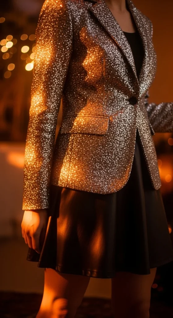 A faux-leather skirt adds texture that complements a glitter blazer. Choose mini or knee-length depending on comfort. Add boots or heels. A simple top underneath keeps the combination balanced. Jewelry can stay minimal. This outfit works well for night events. You can soften the leather with a knit scarf if needed. For a thrifty touch, polish the skirt with a gentle wipe for shine. A clutch in black, silver, or gold suits the palette. The mix of textures helps the outfit stand out without needing too many details.