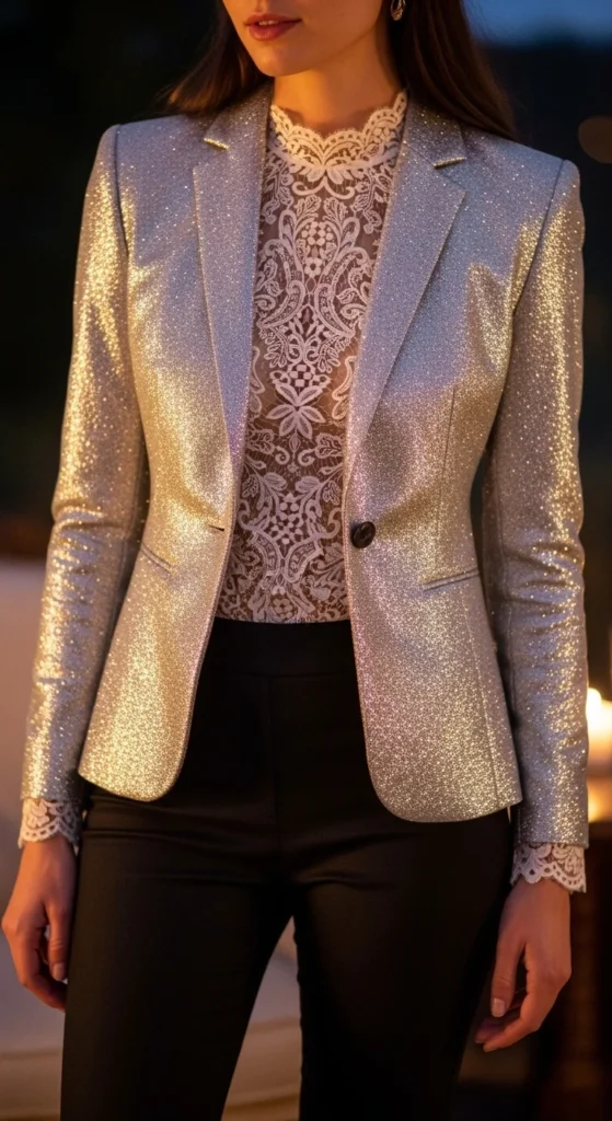 24. Glitter Blazer With a Lace Top and Slim Pants