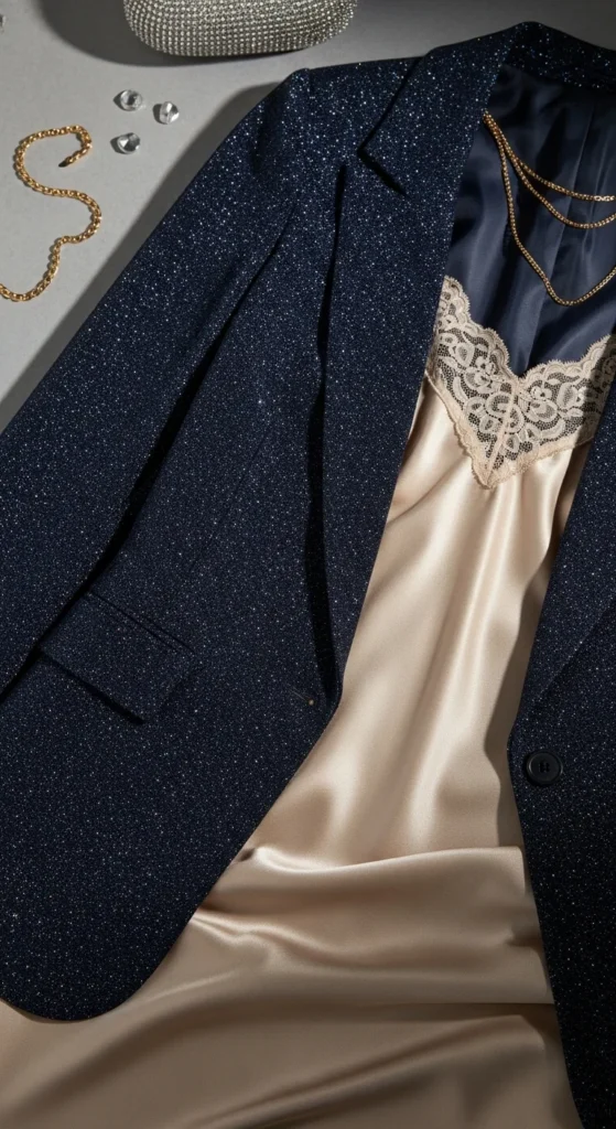 3. Midnight-Blue Glitter Blazer Over a Simple Slip Dress