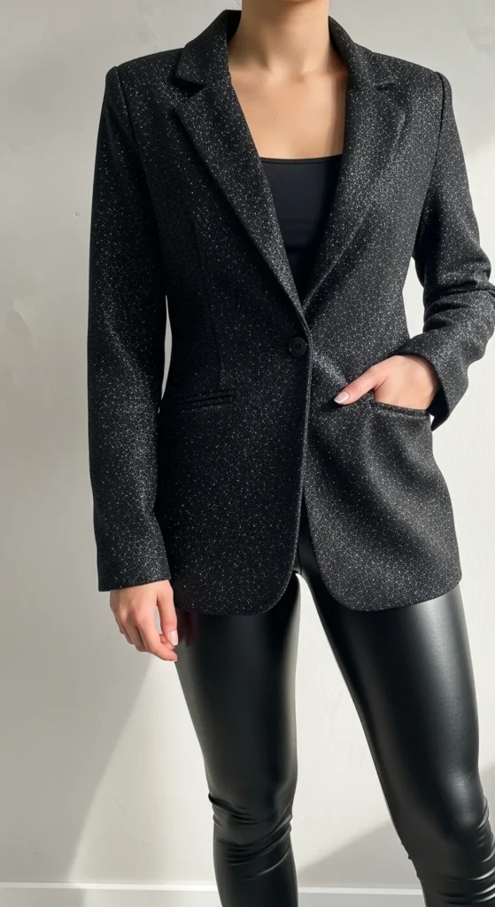 A black glitter blazer offers shine without being too bright, and faux-leather leggings create a nicely balanced contrast. This combination feels sharp and quick to put together. Add a plain tank or bodysuit underneath to keep the lines clean. If you want an easy upgrade, add ankle boots with pointed toes. You can soften the look with a cozy scarf if the weather is cold. To stay budget-friendly, use leggings you already own and simply polish the surface with a gentle wipe for a fresh look. Jewelry should stay minimal since the textures already add interest. Try stacking thin rings for a subtle effect. This outfit works well for nightlife settings or casual countdown hangouts. Carry a structured mini bag for shape. You can also throw on a long coat for warmth without hiding the blazer’s shine. The monochrome approach helps the glitter stand out without overpowering the rest of your outfit.