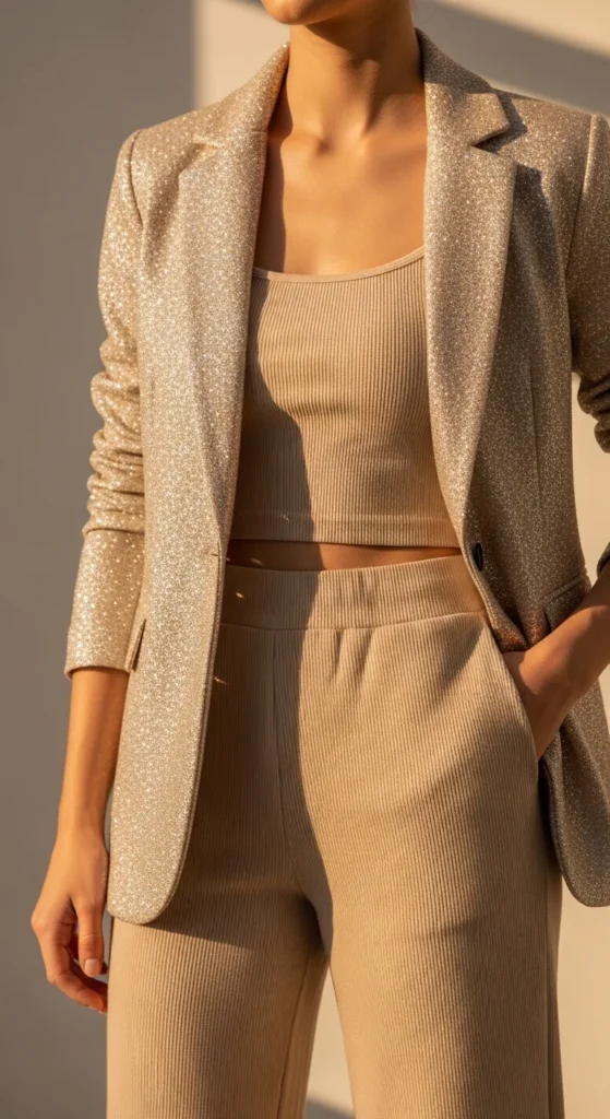 5. Champagne Glitter Blazer With a Monochrome Nude Set