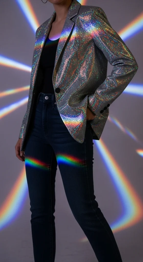 A holographic blazer gives you fun shift-in-the-light shine. Pairing it with dark denim keeps everything grounded. Choose straight-leg or slim jeans depending on comfort. If you want a thrifty approach, reuse older jeans and cuff the hem for style. A plain white or charcoal tee keeps the focus on the blazer. Sneakers work if you’re aiming for a relaxed feel. Add layered necklaces if you prefer a bit of detail. This look fits casual celebrations where you want festive style without dressing up too much. The holographic finish attracts light easily, so keep accessories calm. A small crossbody bag works well. You can also add a beanie or cap for a fun twist. If you want extra shape, tuck in your tee and add a thin belt. This is a good outfit for outdoor events or rooftop settings since the blazer catches city lights in interesting ways.