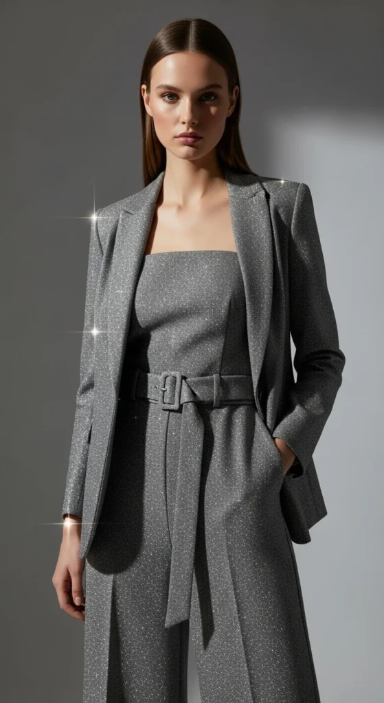 8. Glitter Blazer With a Belted Jumpsuit