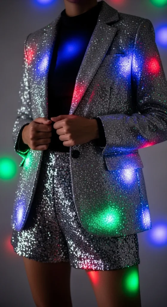 Pairing glitter with sequins creates high shine but can still look balanced if the colors complement each other. Choose neutral or monochrome pieces if you want a calmer effect. Sequin shorts are playful and work well for indoor celebrations. For comfort, pick shorts with a soft lining. A plain tank or bodysuit underneath helps ground the look. Sneakers or low heels keep things manageable if you’ll be walking a lot. This outfit is perfect for party atmospheres where sparkle is encouraged. Add minimal jewelry since the textures already stand out. A small shoulder bag or wristlet works well. You can also drape the blazer gently off your shoulders for photos. If you want a DIY tip, hand-steam your shorts to make the sequins settle smoothly. This combination gives you brightness without needing too many details.