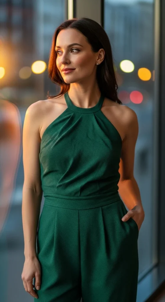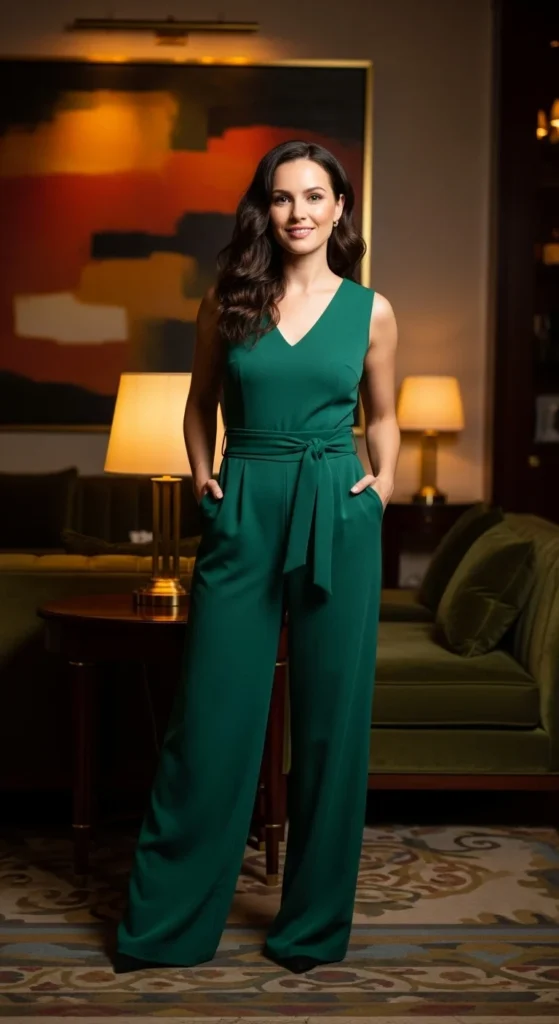 Try low heels if you’ll be standing a lot. Swap in a thin metallic belt to change the look fast without buying a new outfit. A small handheld steamer helps soften wrinkles in minutes. If your jumpsuit has long sleeves, fold them slightly for a relaxed feel. Add a light shimmer on your collarbones for a soft highlight that catches indoor lights. Small adjustments make this outfit work across parties, dinners, or at-home celebrations.