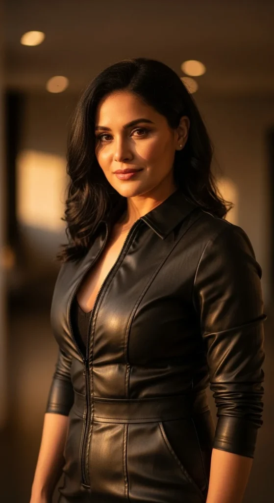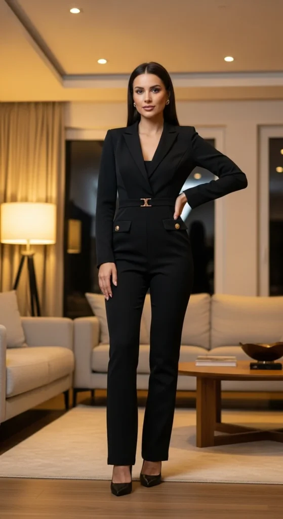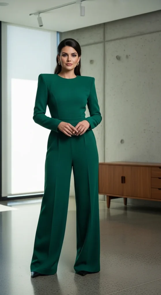[Image Prompt: A high-end camera photo of a woman in a structured-shoulder jumpsuit with defined lines, standing in a modern indoor space. No text shown.]