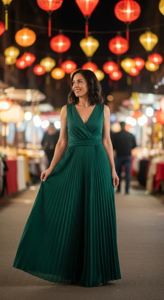 A satin-wrap jumpsuit feels polished without extra effort. The wrap shape shapes your waist while keeping everything comfortable for long celebrations. Pair it with simple stud earrings and a compact shoulder bag. You can reuse accessories you already own to keep things easy on the wallet.