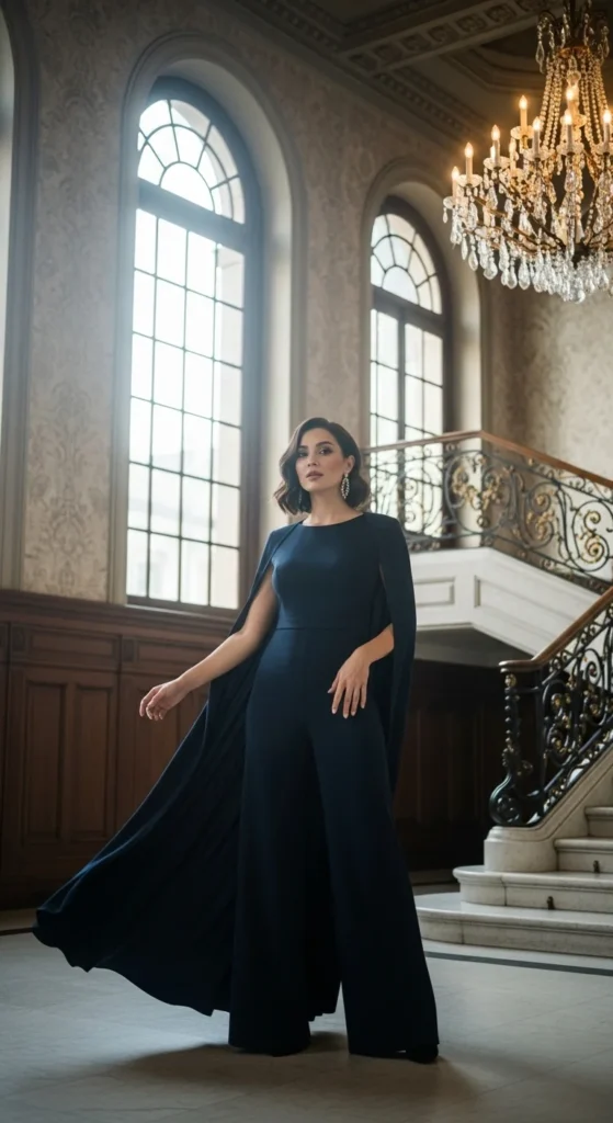 A cape overlay creates instant drama while still being comfortable. Keep accessories small because the shape already stands out.