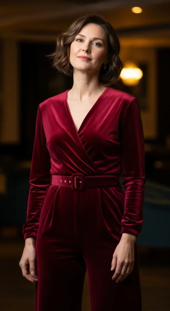 A velvet jumpsuit pairs well with a clutch that has a smooth finish to offset the texture. You can pin your hair to one side using an existing hair clip for a quick style upgrade. For a low-cost update, add a ribbon belt around the waist. Keep makeup soft to let the material stand out.