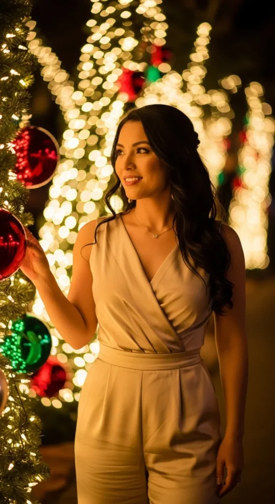 A small crossbody bag keeps your hands free at parties. If the jumpsuit feels too bold, throw on a neutral blazer. A touch of highlighter on your shoulders ties the look together. You can curl only the front sections of your hair for a quick, easy style.