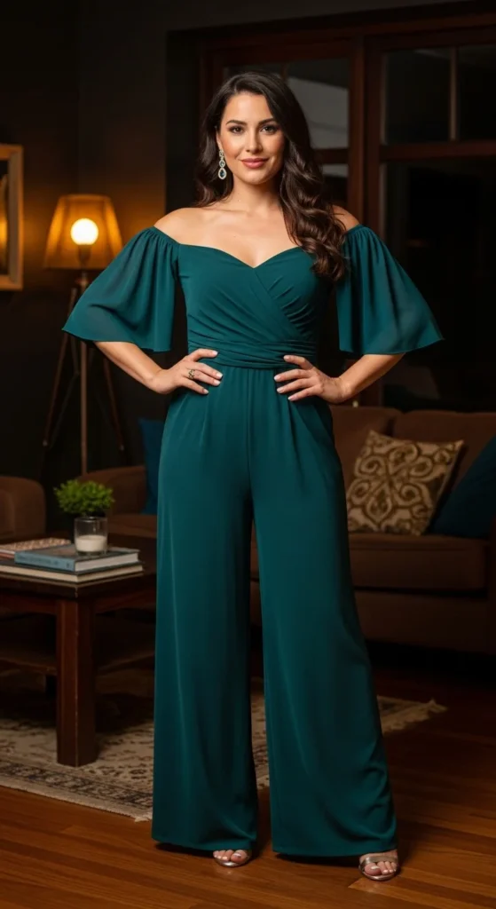 Off-shoulder jumpsuits highlight your neckline in a clean, elegant way. Add a simple choker or thin necklace for definition. If you prefer comfort, choose low sandals or wedge heels.