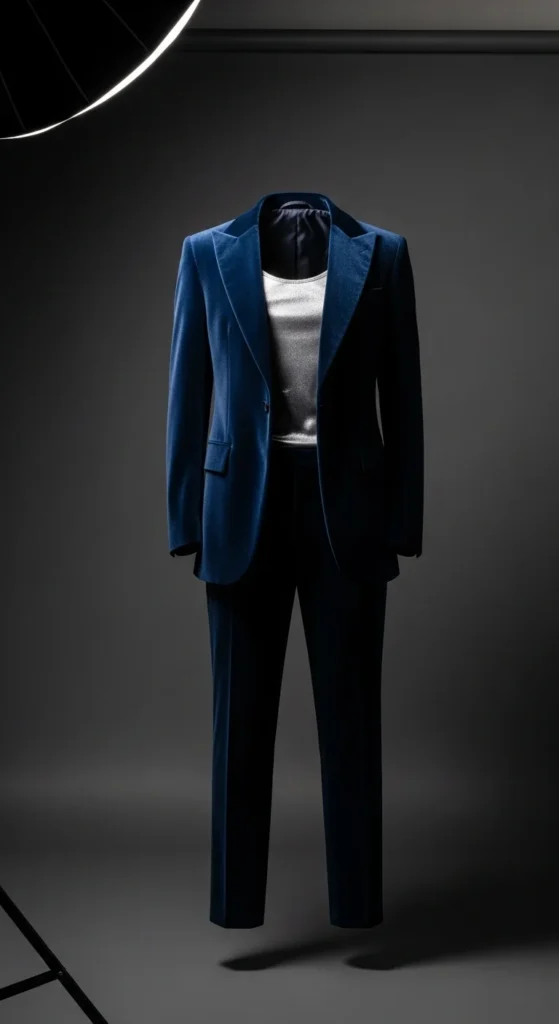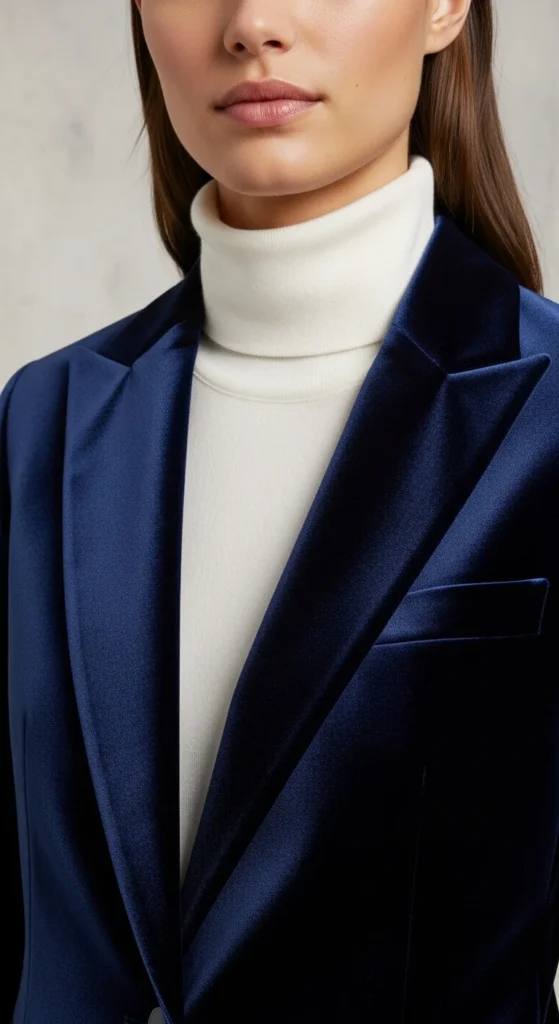 1. Midnight-Blue Velvet Suit with White Turtleneck
