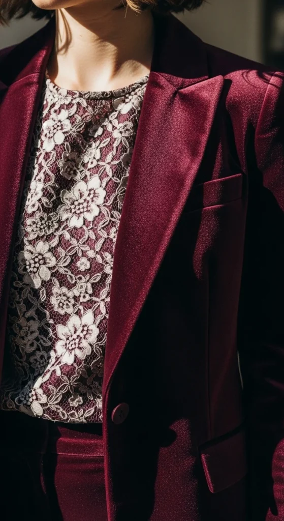 A plum velvet suit with a lace top creates a stylish contrast that works beautifully for nighttime celebrations. The lace adds softness, while the velvet adds depth. Keep accessories minimal to let the fabrics shine.