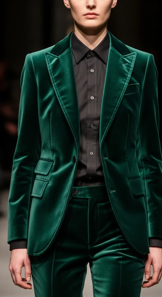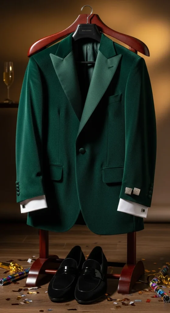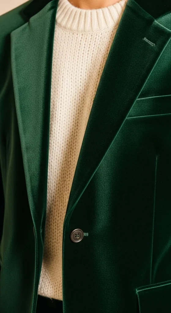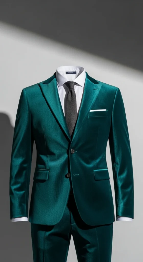 A deep-emerald velvet suit feels confident and works well for nighttime plans. Pairing it with a black button-down keeps things sharp without adding extra colors. Choose a matte shirt instead of a shiny one so the velvet stays the focus. A simple chain or ring can add interest if you like details.