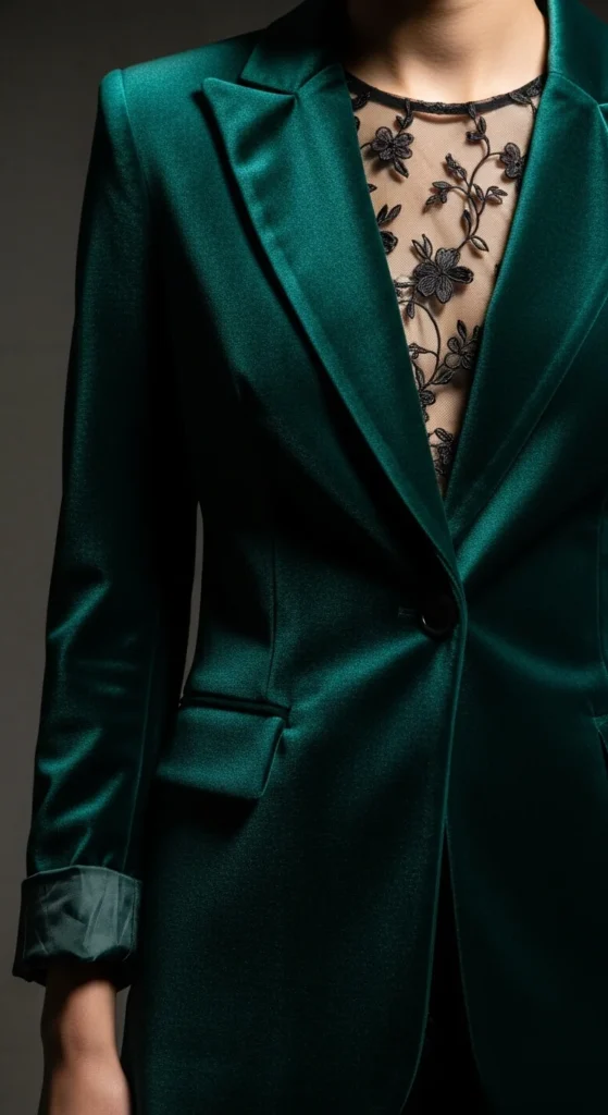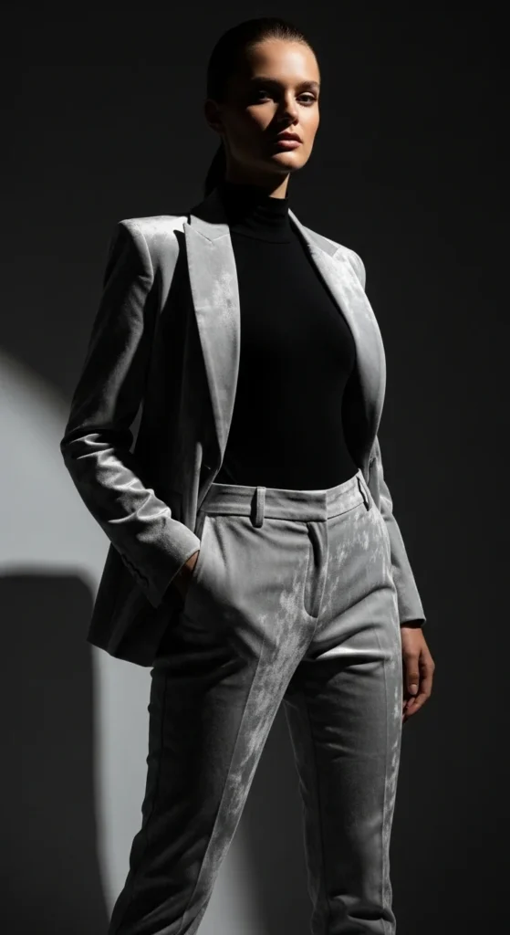 A silver velvet suit offers a confident look, and pairing it with a black bodysuit keeps everything grounded. The bodysuit’s clean lines help the suit’s texture stand out.