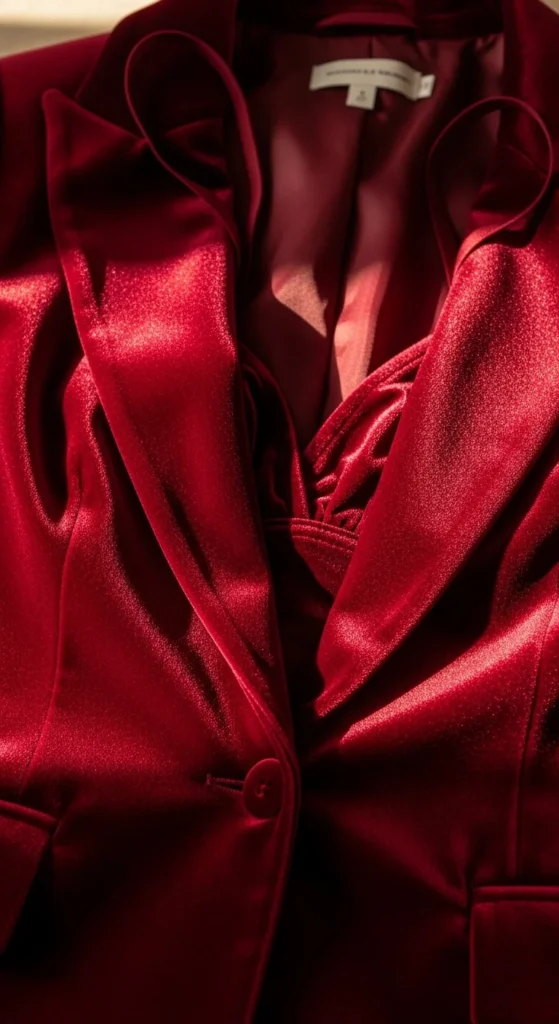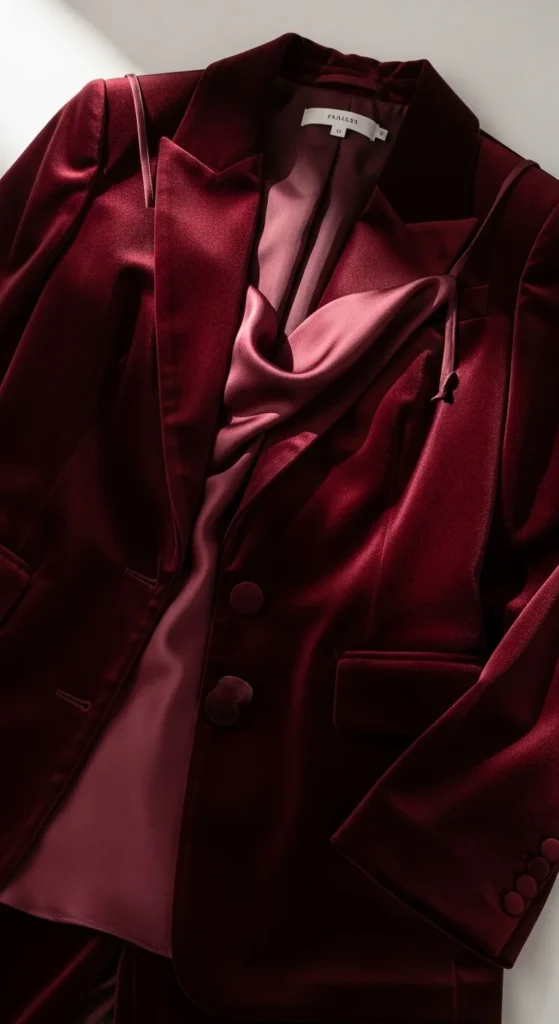 A ruby velvet suit paired with a matching bralette creates a bold and confident look. Keeping both pieces in the same color makes the outfit feel unified and strong. Add simple jewelry to avoid overcrowding.
