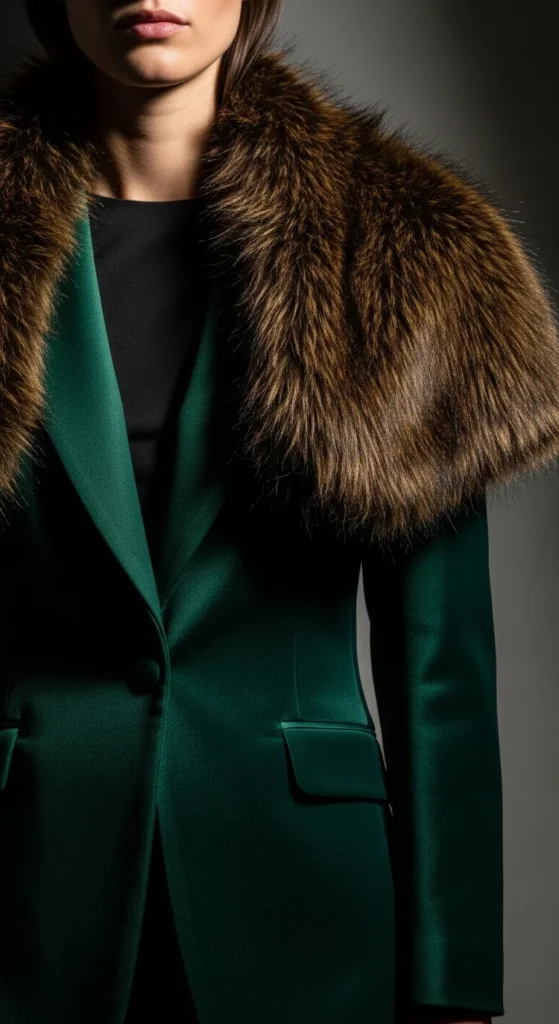 Adding a faux-fur stole to a velvet suit gives the outfit a warm, glamorous twist. Choose soft neutral tones so the look stays balanced. This layering also helps in outdoor winter settings.