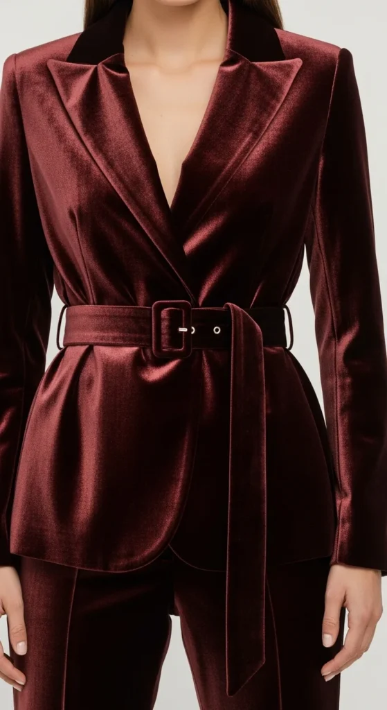 Cinching a velvet suit with a belt adds structure and shape without requiring tailoring. Choose a medium-width belt so it defines the waist without looking bulky.