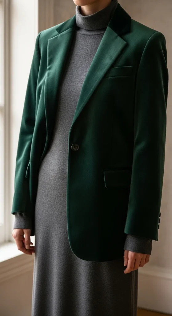 Layering a velvet suit over a turtleneck dress creates a sleek silhouette that works well for colder weather. Choose a dress that’s not too thick so the blazer fits comfortably.