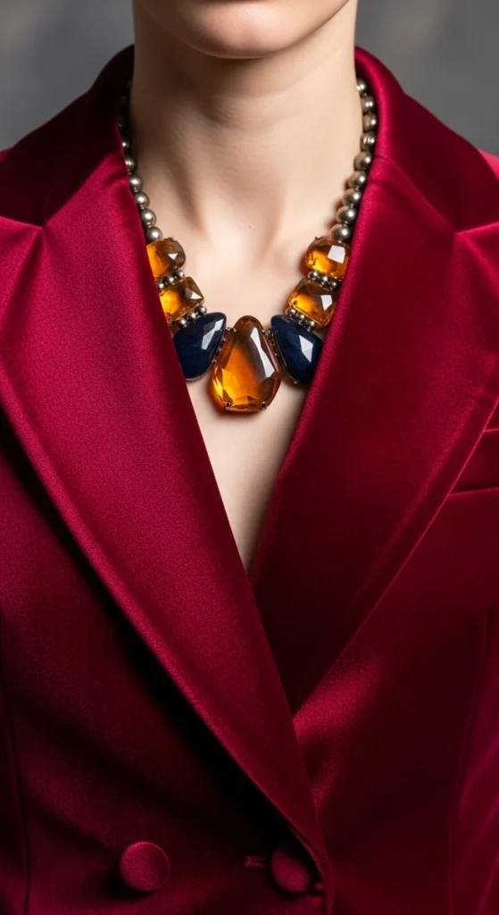 A statement necklace works nicely with velvet because the fabric’s richness makes a great backdrop. Choose a necklace with clean shapes so the outfit stays balanced.