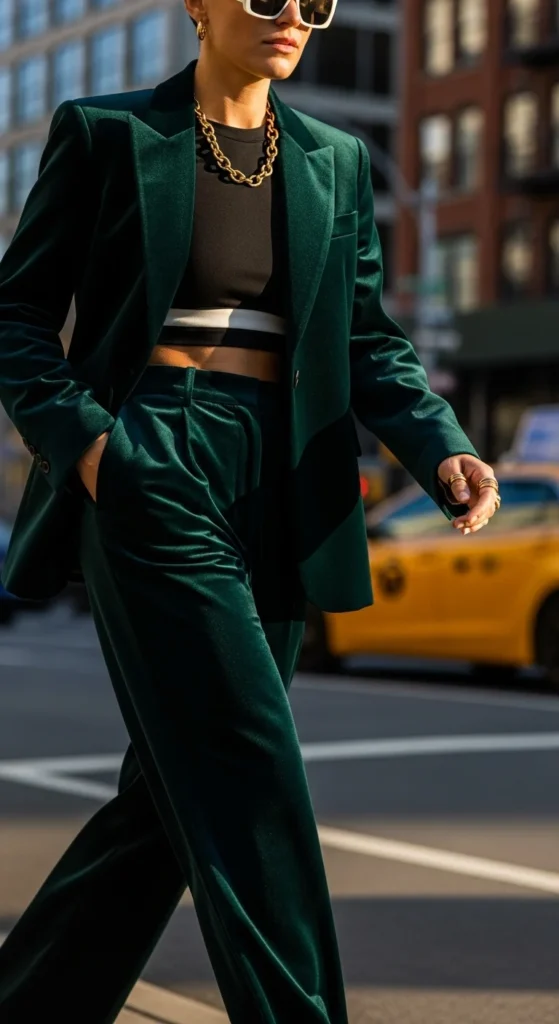A cropped top adds a strong modern touch to a velvet suit. It keeps the outfit light and balanced while the velvet carries the boldness. Choose neutral or matching tones depending on the suit color.