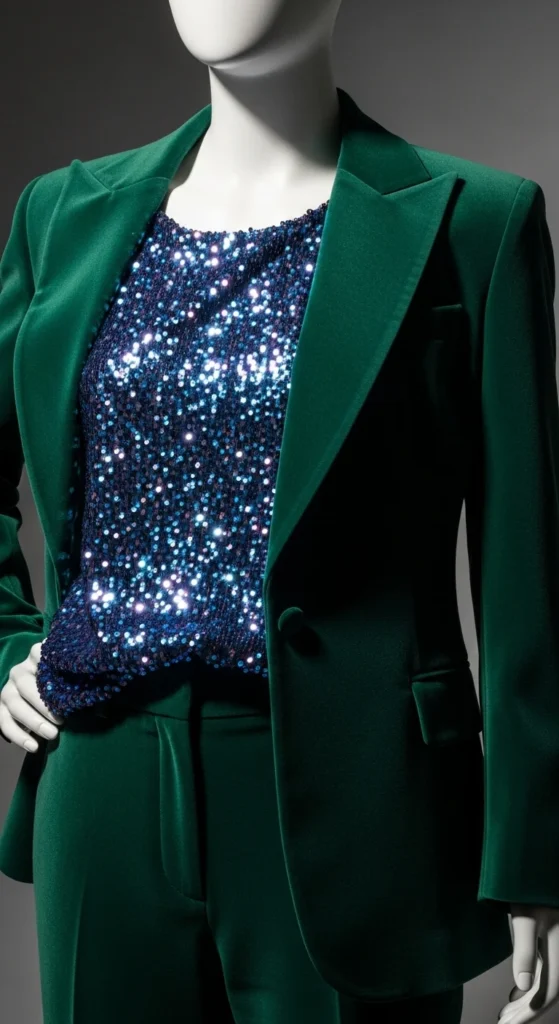 A sequined top adds sparkle under a velvet suit and creates a strong party vibe. Choose small, tight sequins so the texture doesn’t overpower the velvet.