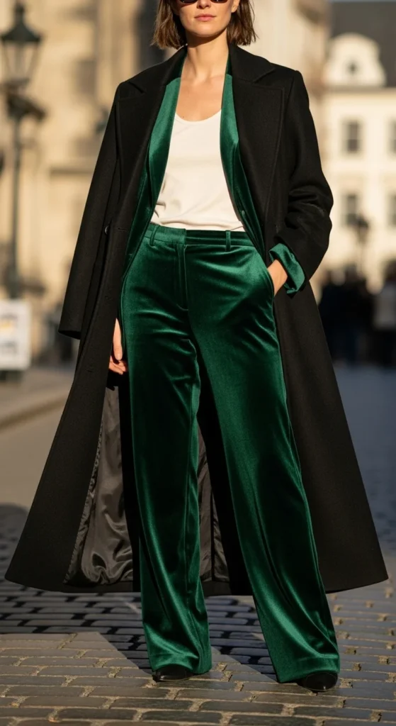 Forest-green velvet pairs beautifully with cream because the colors balance each other. This combination feels cozy and refined for winter celebrations. Choose a lightweight sweater so the layers don’t feel bulky.