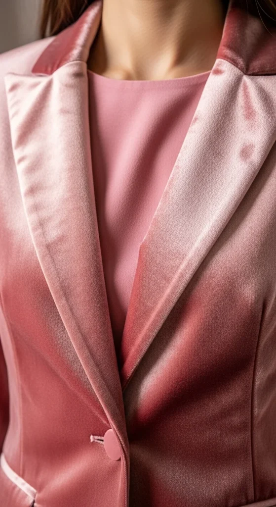 A rose-velvet suit feels playful yet standout, especially when you keep everything underneath in the same color family. Monochrome styling makes it easy because you don’t have to think about matching shades. Add nude or blush shoes to keep the palette soft.