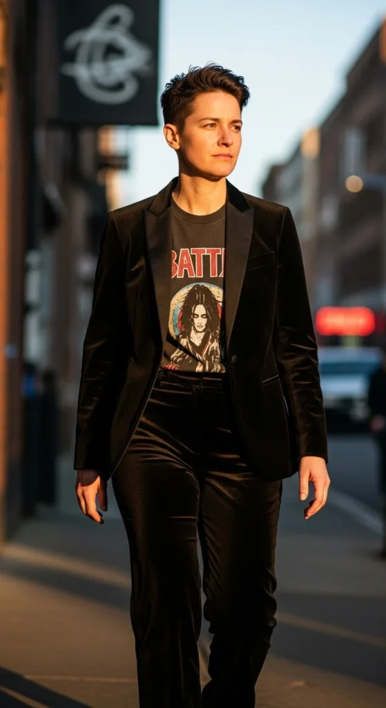 A black velvet suit paired with a graphic tee makes the look feel relaxed and modern. It works well when you don’t want to feel too formal but still want something special for the occasion. Choose a tee with simple colors so it doesn’t compete with the velvet.