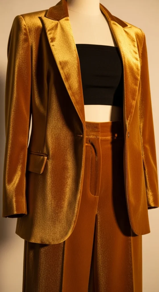 A gold velvet suit immediately stands out, and pairing it with a black bandeau keeps the look balanced. The contrast helps the gold shine without feeling overwhelming. Add black heels or boots to tie everything together.