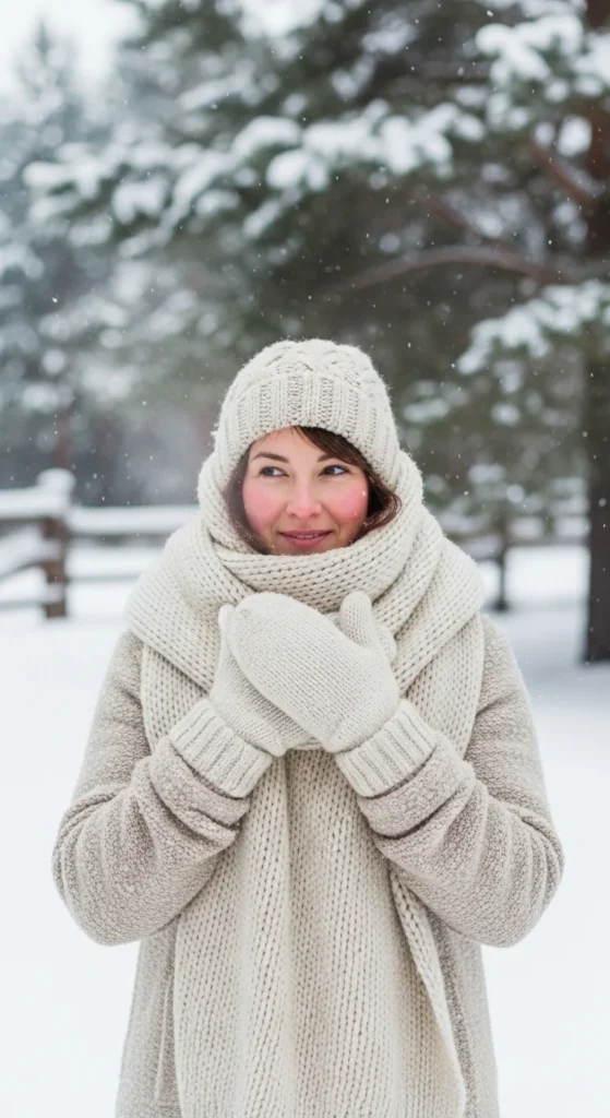 You can buy a set or knit one yourself if you know how. Choose soft fabric for comfort. Small details can make you feel more put together in the cold.