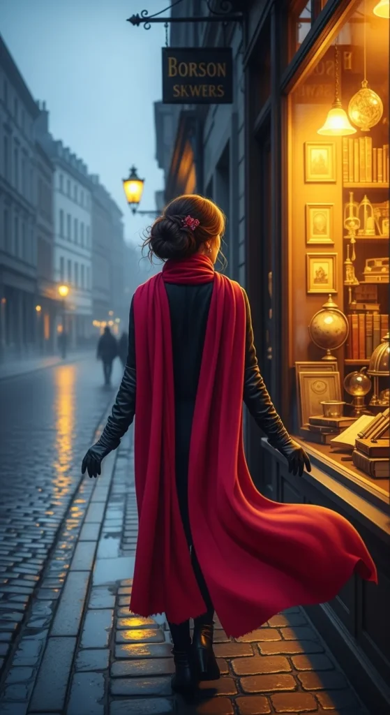 A long scarf wraps multiple times around your neck. Leather gloves protect your hands from icy air.